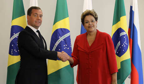 Дмитриј Медведев је стигао у Бразил на позив председника земље Дилме Русеф. Њихов сусрет је био први у програму визита премијера. Разговор је ишао у правцу развоја политичког дијалога који је остварен између Русије и Бразила на највишем нивоу: од 2002. године председник Русије је два пута посетио Бразил, а бразилски председник четири пута Русију (последњи визит је био у децембру 2012. године и подударио се са рођенданом Дилме Русеф). Ову чињеницу је поменуо и Дмитриј Медведев у свом говору: