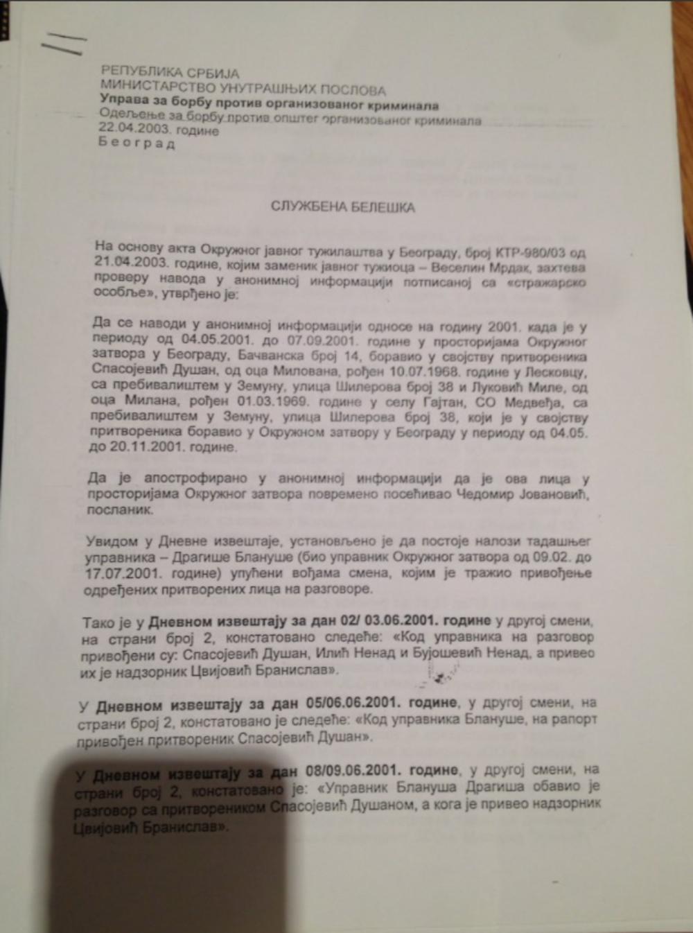 У службеној белешци пише да је у те 2003. године у анонимној информацији дојављено да је тада посланик Чедомир Јовановић посећивао Шиптара.