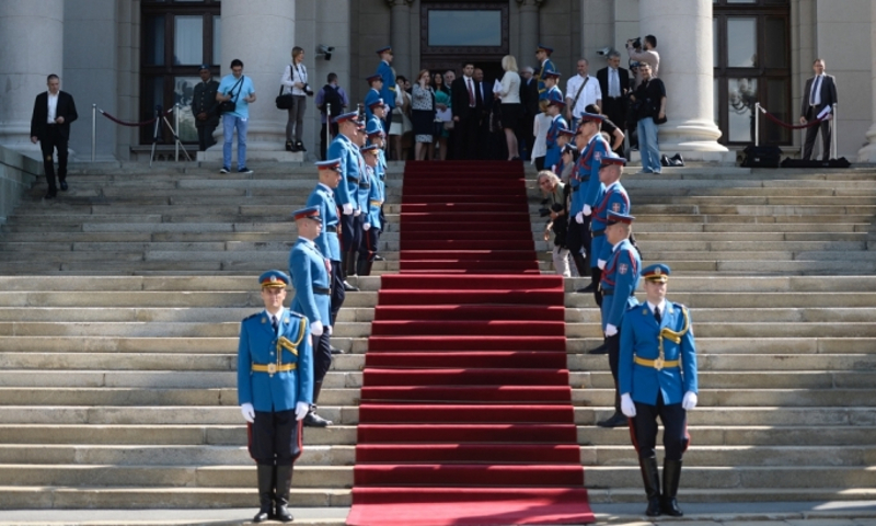 Нове посланике Народне скупштине Републике Србије су на улазу у здање на Тргу Николе Пашића, дочекали црвени тепих и свечана јединица Војске Србије.