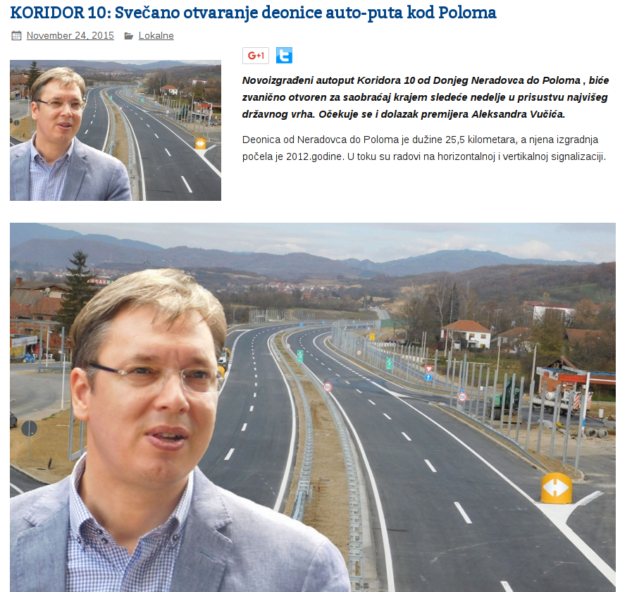 Свечано се слави почетак изградње пута, па се онда свечано слави завршетка деонице пута, па се онда слави када пројекат стигне до 40%, па се свечано слави пробијање тунела иако је пробијена само једна трака тог истог тунела а не две како је пројектом предвићено, итд.
