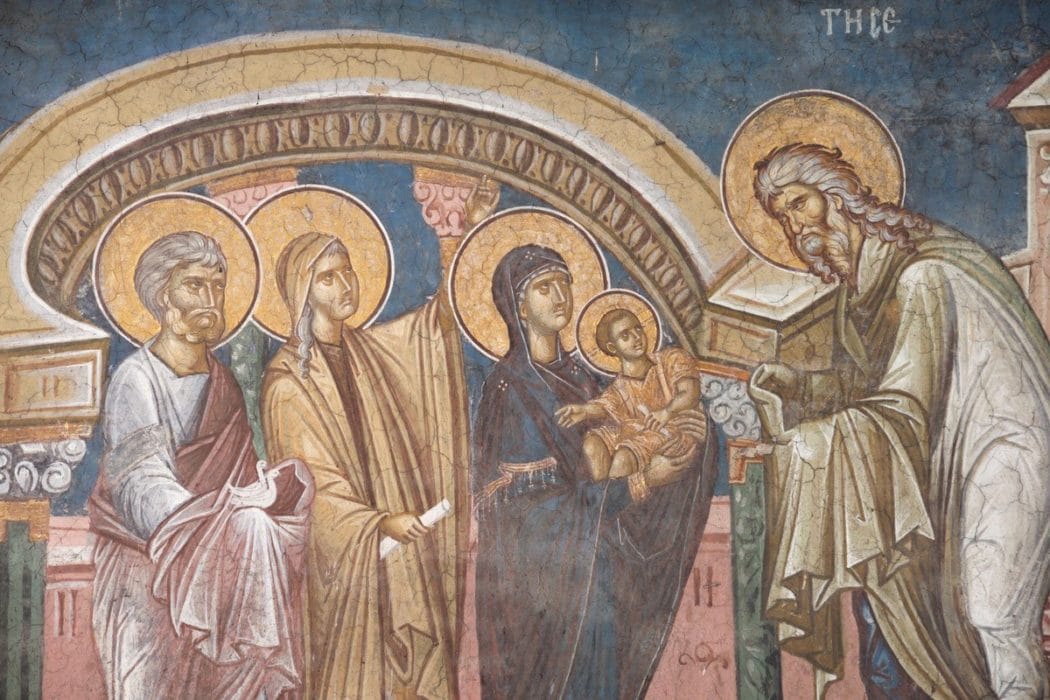 У питању је први сусрет Бога и човека под сводовима јерусалимског храма и сретење новорођеног Месије кога је у наручје примио праведни старац, познат као свети Симеон Богоносац.