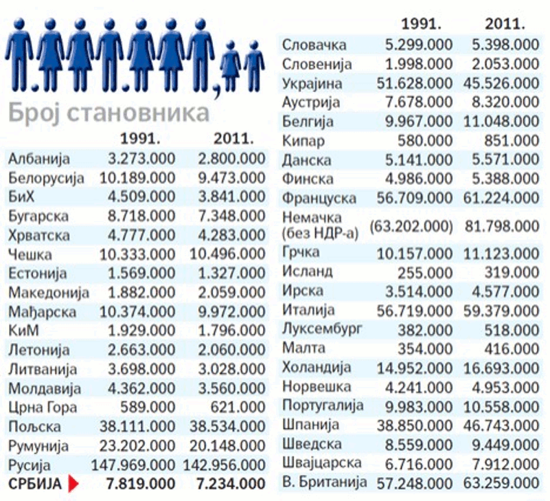 Међутим, када је о земљама у транзицији реч, овај „рекорд” Србије није необичан. Све бивше социјалистичке земље после пада Берлинског зида бележе слична негативна демографска кретања. Неке су имале и негативнији биланс од Србије. Земље западне Европе, међутим, у протеклих 25 година, бележе друкчије трендове и у вези с бројем новорођених и са укупним кретањем становништва. Разлике су толико очигледне да данас у том погледу можемо говорити – о две Европе. У једној, коју чине бивше социјалистичке земље, 1990–2015, забележен је пад броја становника за 22 милиона, док су остале европске земље у порасту за 41 милион становника.