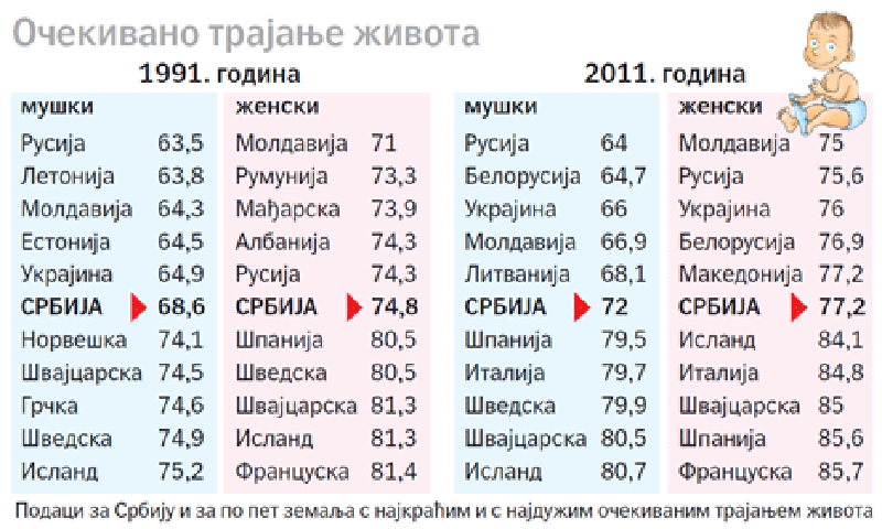 И у Србији очекивано трајање живота бележи стални раст, али наша земља у том погледу релативно заостаје: пре двадесет година била је готово на средини европске табеле, а сада је ближе зачељу.