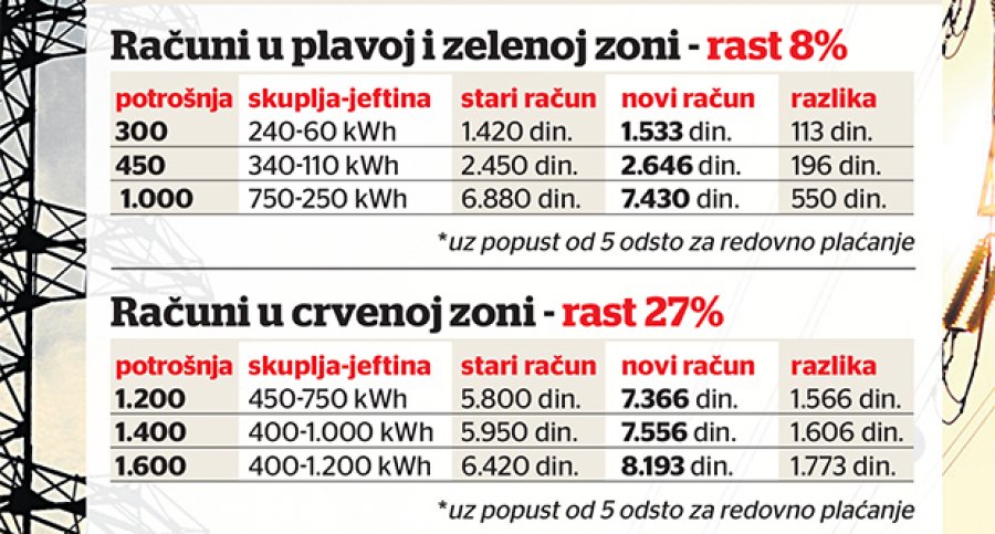 Изменом тарифног система у црвену зону би требало да се улази с потрошених 1.200 киловат-сати, а не као досад, са 1.600. То значи да ће за све оне који сада троше више од 1.200 киловата и сада су у плавој зони, јефтина струја поскупети са 2,2 на 4,5 динара, а скупа са девет на 18. Предложено је и да јефтинија струја у црвеној зони уместо 4,5 динара кошта шест динара.