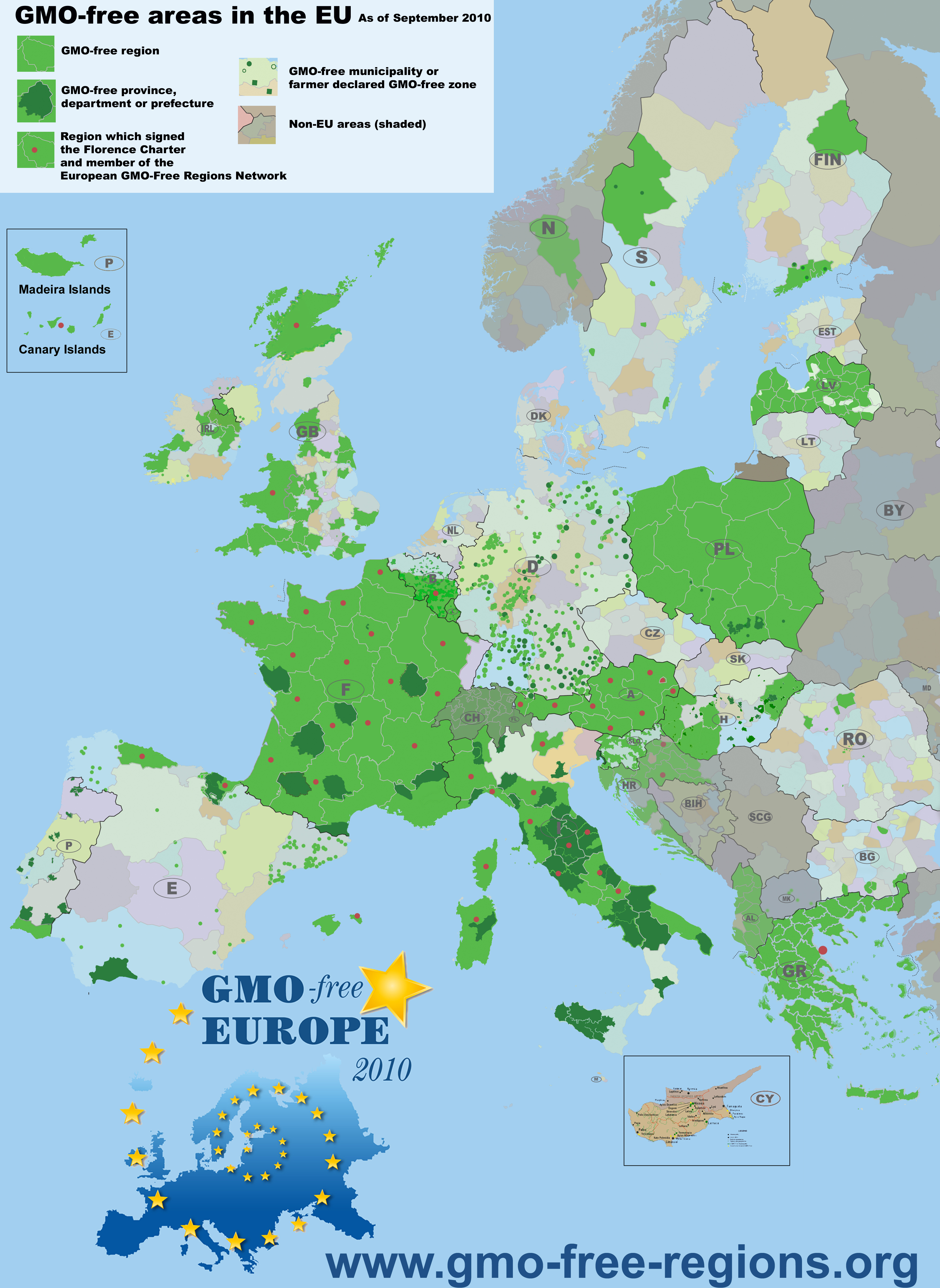 Регулатива ЕУ каже да свака земља еврозоне може сама да регулише заступљеност пласмана и промета ГМО, па је површина под овим организмима и даље мала. Статистика показује да су генетски модификовани усеви лане заузимали 114.525 хектара од укупно расположивог 110 милиона хектара. Од 27 чланица Уније, 19 је рекло „не“ за генетски модификоване организме.