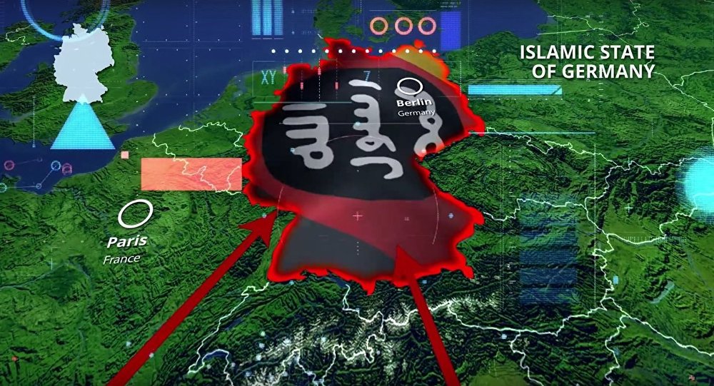 На снимку су, између осталог, познате немачке знаменитости попут Бранденбуршке капије на којој се вијори застава ИД, као и катедрала у Келну, на чијим врховима се види полумесец са звездом.