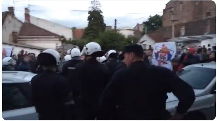 Како Радио Слободна Европа незванично сазнаје од полиције, у питању су припадници навијачких група. Носили су транспаренте са заставом Косова преко којег је грб Србије и натпис „Нема предаје“ и скандирали су погрдне пароле Албанцима. Како јављају репортери РСЕ, учесници фестивала су затворени у сали у којој се одржава програм, а кордони полиције у опреми за разбијање демонстрација ушли су у двориште и налазе се испред главног улаза чије су капије затворене.