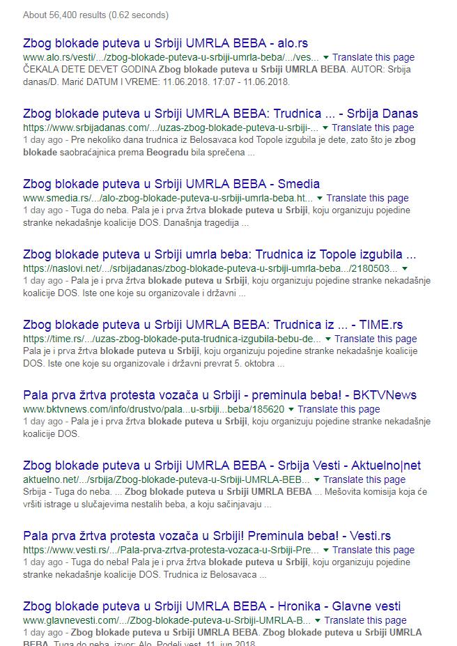 “Али смо имали и другу лажну вест да је за време блокаде нека беба умрла, зато што није могла да прође Хитна помоћ. Нико није хтео тиме да се позабави, а камоли да пронађе и ухапси онога ко је дао ту вест. (Објављено је у таблоиду Информер) Нико од надлежних органа се није бавио том лажном вешћу, а бавили су се лажном вешћу о води. Хоћу да кажем – постоји систем лажних вести и постоји истрага о систему лажних вести, али је она баждарена према политичкој потреби, није баждарена према чињеницама”, навео је.