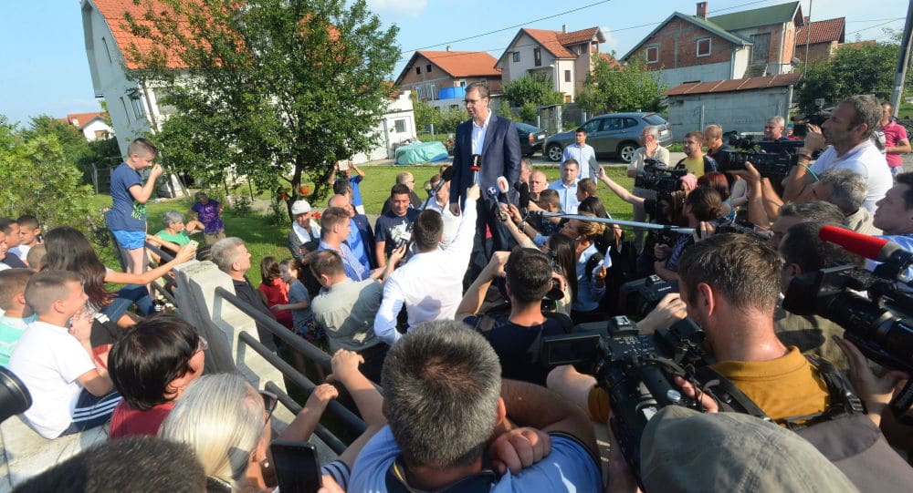 Вучић је замолио окупљене да пренесу комшијама да је апеловао да се одговорно понашају и да не бетонирају одводне канале, те додао да се не може спречити елементарна непогода.