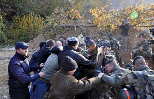 Мали број Срба покушао је да заштити барикаду која је била висока изнад два метра, али су их војници Кфора изгурали и направили „живи зид“, односно кордон испред барикаде, јавља Танјуг.