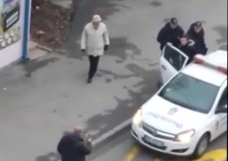 Снимак који је настао у Земуну на аутобуској станици приказује тројицу комуналних полицајаца како која се опире и плаче стављају лисице на руке док она сво време запомаже и виче да је пусте.