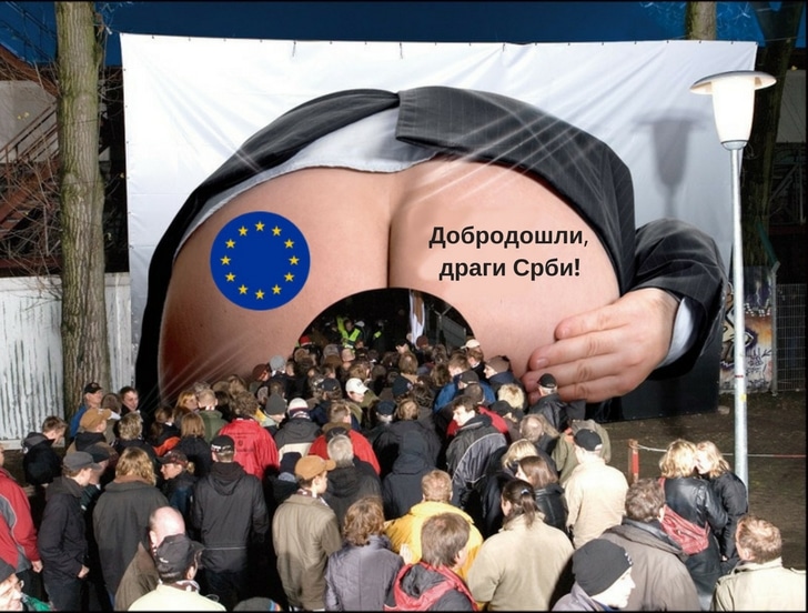 Пођимо, браћо и сестре, који сте постали господа и Европејци, право у Европску унију! Тамо нам је место, јер су тако рекли! Нема живота ван ЕУ, то нам је ваљда јасно! Признајмо Косово, помогнимо у рушењу свега нашег на њему, заборавимо ратове, страдања, свеце и славе, заборавимо православље, растргнимо земљу на комаде, саградимо шопинг молове и укључимо телевизоре да, поред нашег уласка у ЕУ, и ЕУ уђе у наше куће!