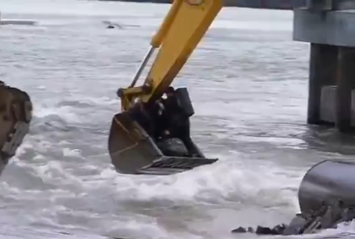 Погледајте како су се снашли радници који се уз помоћ багера превозе са једне обале на другу. Изгледа једноставно, али може бити изузетно опасно, посебно када из једне кашике треба да пређу у другу, а обе висе над леденом водом.