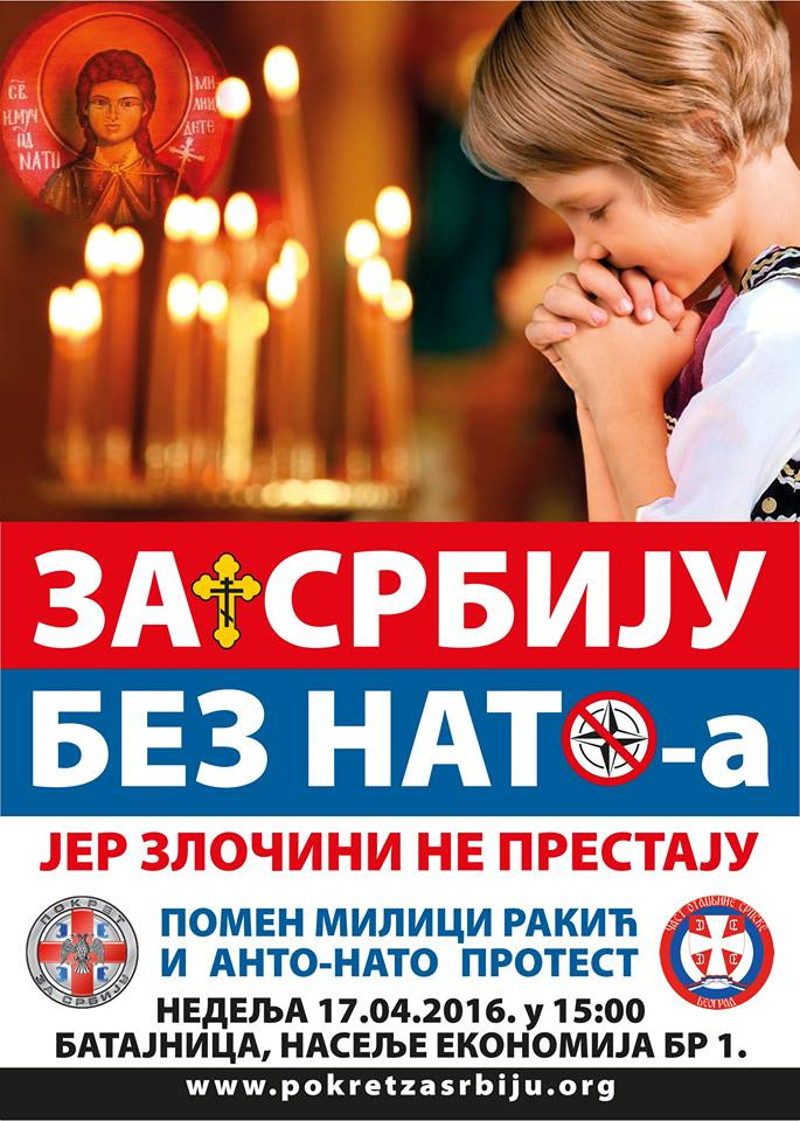 Покрет за Србију и удружење РС-Част отаџбине, позивају вас да 17. априла у 15 часова, на годишњицу погибије мале Милице Ракић, учествујете у помену и протесту против савремених фашиста – НАТО агресора, убица и окупатора, у Батајници, крај спомен-чесме на игралишту које носи Миличино име.