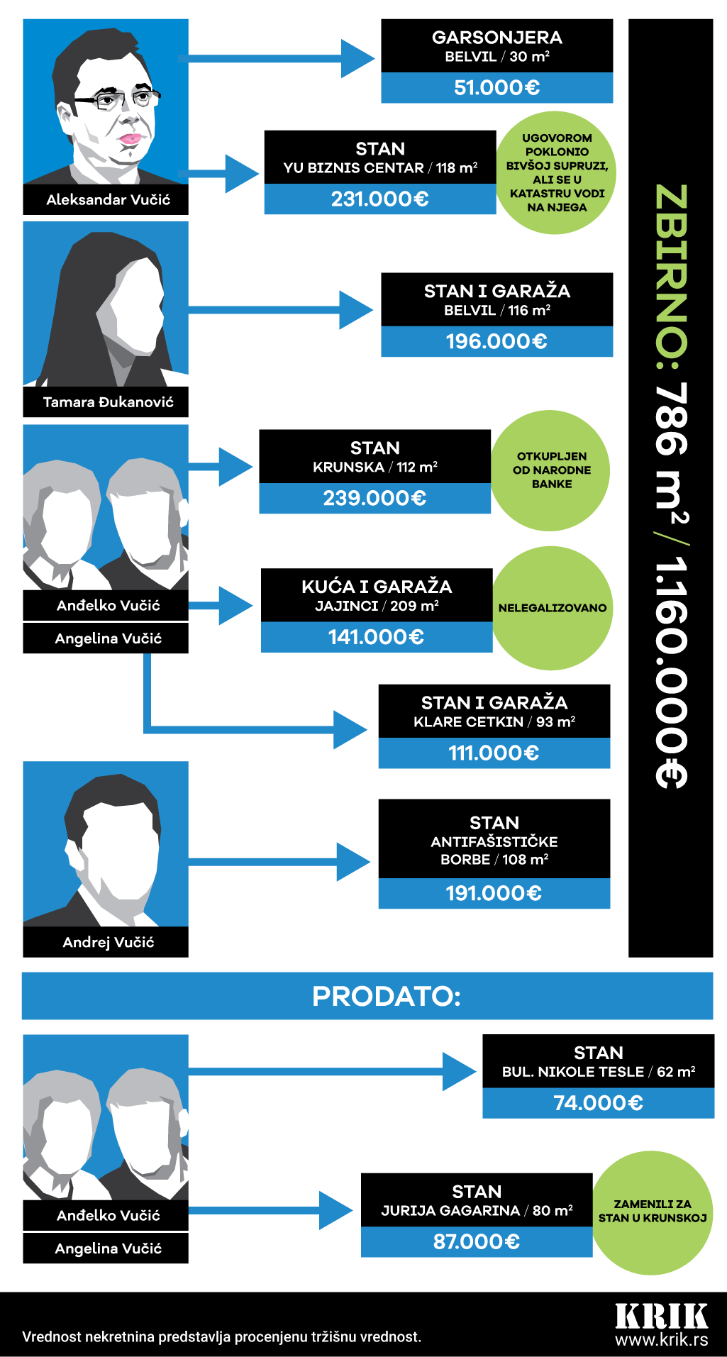 Укупна површина некретнина, не рачунајући недавно продат стан, је 786 метара квадратних, а према тржишним ценама вреде милион и сто шездесет хиљада евра. Недавно продат стан вредан је 75.000 евра.