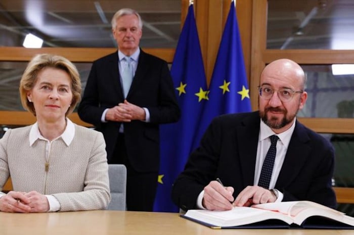 Председник Европског савета Шарл Мишел објавио је на твитеру фотографије са потписивања са Урсулом вон дер Лајен, у присуству европског преговарача за Брегзит Мишела Барниеја.