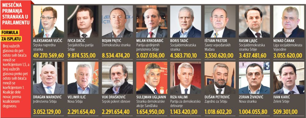 Планом државне касе било је, наиме, утврђено да странке које имају своје посланике у парламенту у овој години поделе 1.293.600.000 динара. Ребалансом ће им на располагању бити чак 1.941.428.000 динара, тј. 647,8 милиона динара више, односно 5,5 милиона евра.