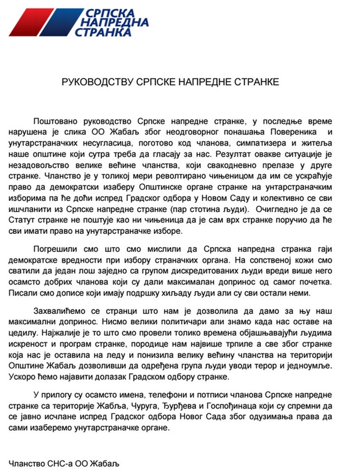 – Чланство је у толикој мери револтирано чињеницом да им се ускраћује право да демократски изаберу Општинске органе странке на унтарстраначким изборима па ће доћи испред Градског одбора у Новом Саду и колективно се сви ишчланити из Српске напредне странке (пар стотина људи), наводи се у интерном допису који су огорчени чланови из Жабља доставили порталу Телепромптер.рс.