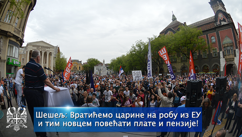 Он је такође истакао да се Србија одрекла пола милијарде евра укидањем царина на робу из Европске уније и најавио повратак царина како би се тај новац искористио за повећање плата и пензија.