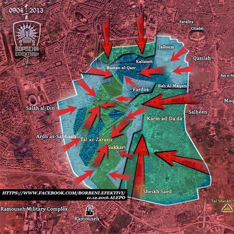Сиријске оклопно-механизоване јединице, ојачане тенковима Т-90, спојиле се на више локација унутар обруча и практично успоставиле пуну конттролу над свим главним комуникацијама и раскршћима у граду, те ослободиле цели Алепо. Иза њих, пешадијске јединице детаљно чешљају споредне и попречне сокаке и уличице у потрази за терористима.