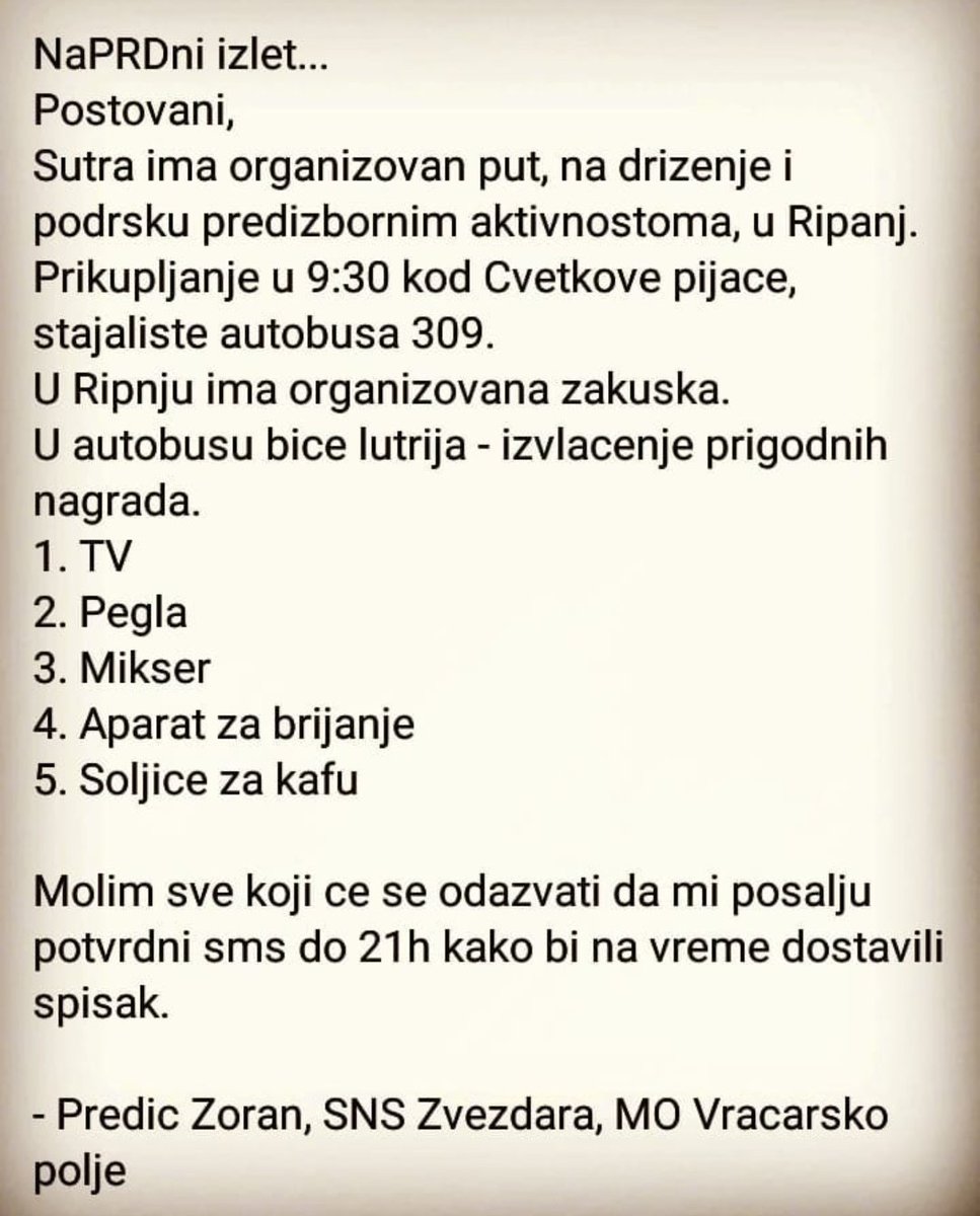 Нажалост, као и у осталим својим болештинама и у овом циркусу су отишли корак даље, па за ове београдске изборе у аутобусима организују лутрију где деле разне награде, погледајте уосталом у слици испод.