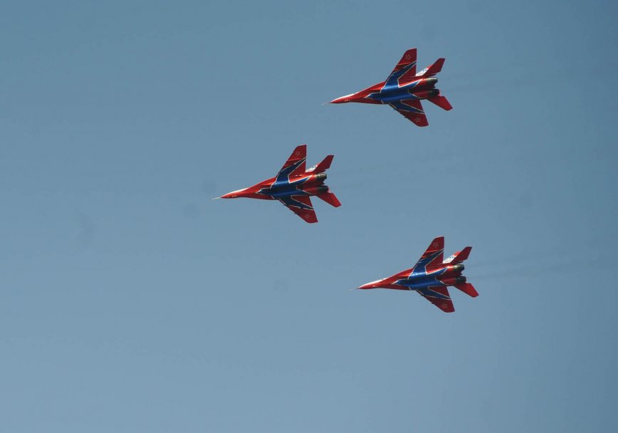БЕОГРАД – Руска акробатска летећа група „Стрижи“ данас је у Батајници представила групно акробатско летење са три авиона „миг 29“ и посетиоцима аеромитинга демонстрирала зашто је њихова група светски позната. Руски пилоти су миговима летели веома близу један другоме, у правилној формацији спуштали се и до стотинак метра од тла да би се, потом, не мењајући формацију попели до великих висина.