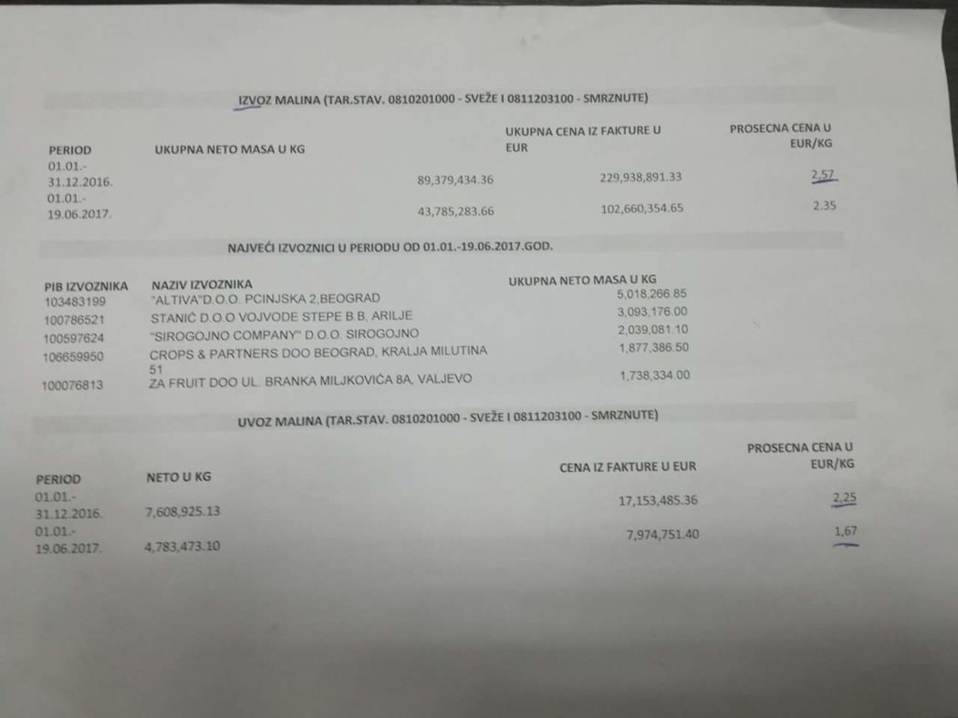 Од нашег читаоца добили смо извозно увозну листу за малине које су ове и прошле године извезене и увезене из и у Србију. Сда лепо треба д авидимо ко су ти лопови који у овој земљи због грамзивости и алавости желе д ауниште највећи извозни производ а са њим и десетине хиљада породица које од њега живе.