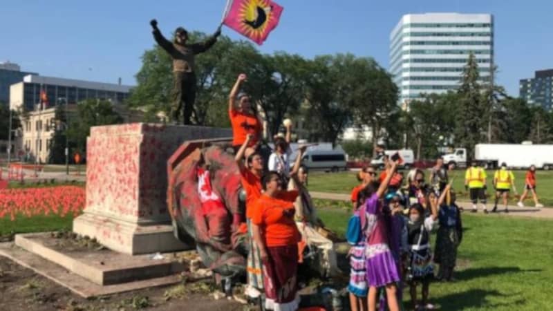 * Статуе су се налазиле испред зграде парламента државе Манитобе у Винипегу. Полиција није ни малим прстом мрднула да спречи „вандализам“…