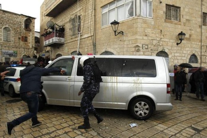 Десетине Палестинаца протестовало је у Витлејему на Западној обали поводом доласка јерусалимског патријарха Теофила Трећег. Демонстранти су се сукобили са…