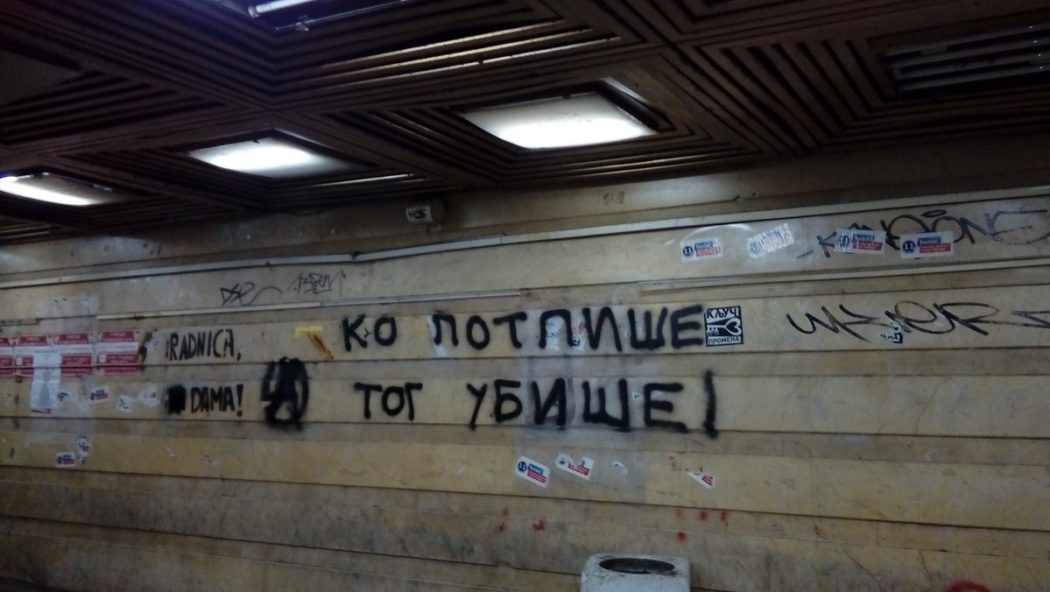 „КО ПОТПИШЕ ТОГ УБИШЕ!“ графит на зиду пешачког пролаза Зелени Венац 15. мај 2018. Београд ВасељенскаТВ