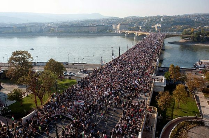 Учесници такозваног „Мировног марша“ упутили су се преко моста Маргит на Дунаву ка мађарском парламенту, где ће Орбан данас говорити на скупу поводом 170. годишњице избијања Револуције из 1848. године и рата за независност против династије Хабзбург.