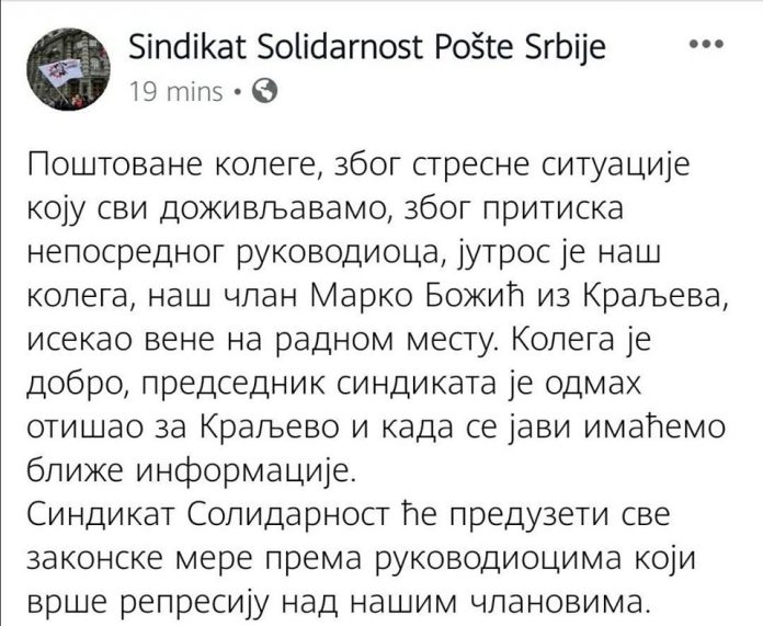 Наиме, према речима Синдиката поште, извесни Марко Божић је јутрос на свом радном месту у Краљеву исекао себи вене.