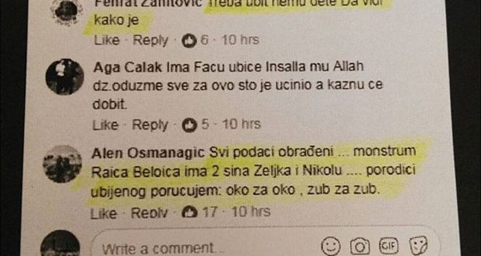 На друштвеној мрежи „Фејсбук“ већ су се појавиле претње породици полицајца, који је Србин, где се позива на крвну освету и убиство двојице његових синова уз поруку „око за око, зуб за зуб“.