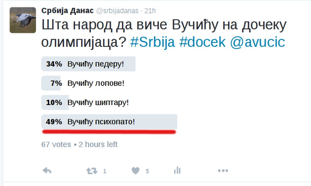 Србија данас је јуче поставила питање нашим цењеним читаоцима шта скандирати премијеру Вучићу данас приликом тог дочека и ви сте одлучили и то огромном већином да премијеру Вучићу треба скандирати „Вучићу психопато“. То је био ваш одговор и избор на наше питање у анкети која је имала четири могућа избора док сте и у коментарима на друштвеним мрежама масовно избрали „Вучићу психопато“ мада је било оних који су на нас били помало љути што нисмо имали и пети избор који би гласио „Сви горе наведени“.