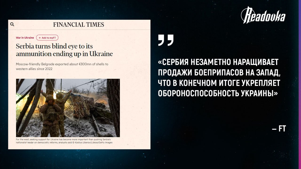 Србија неприметно повећава продају граната Западу, што у крајњем исходу ојачаву одбрамбену способност Украјине – објавио је „Фајненешел тајмс“, а преноси један од најпопуларнијих руских Телеграм канала Ридовка (t.me/readovkanews/81891).