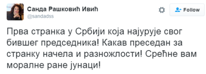 Таква судбина већ је задесила и Социјалистичку партију Србије, коју у животу одржава само још Ивица Дачић. Кад га Вучић пусти низ Миљацку, а то мора да се деси кад-тад, у СПС-у неће остати нико. Бившу Милошевићеву партију одавно су напустили сви поштени и морални левичари. Уз Дачића су остали доказани мафијаши и контроверзни бизнисмени, који политичке ставове граде на основу процене колику провизују могу да добију и колико година робије да избегну. Наравно, чим њихов тренутни председник зглајза, они ће претрчати у табор јачег, дакле код Вучића. Александар Антић је то већ урадио, а дојучерашња потпредседница СПС-а Дијана Вукомановић отворено се нуди. Кад се Вучић поредио са маршалом Титом, часна Дијана му се препоручила Балашевићевим старим стиховима „рачунајте на нас“.