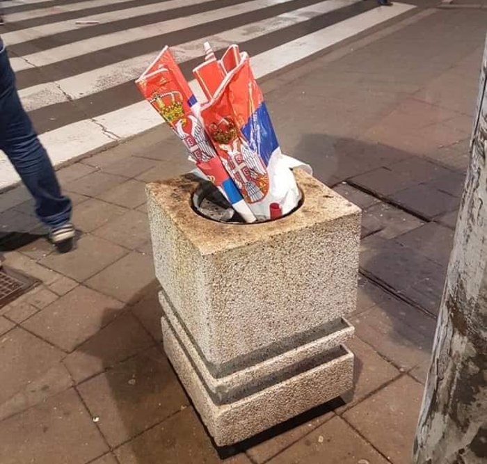 Јуче си Вучићу на митингу продавао маглу како сви Срби треба да стану под једну заставу. Ево ти заставе Републике Србије коју сте јуче после тог сајма лудака у Београду као бесловесна стока побацали по улици и контејнерима за ђубре.